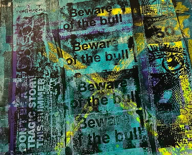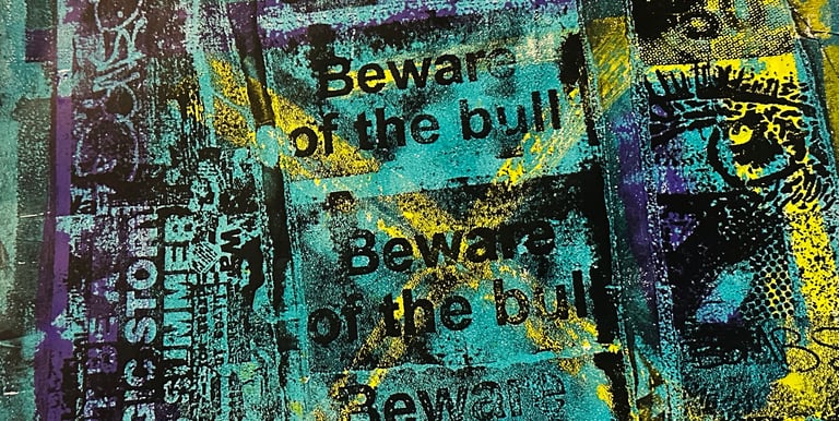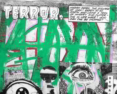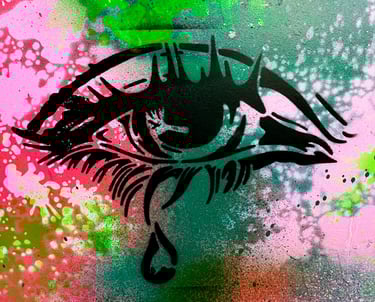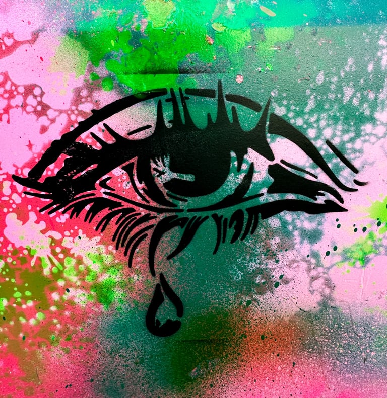 Her work sits at the crossroads of contemporary art, street art, and experimental printmaking, transforming dark humour into luminous visual storytelling.