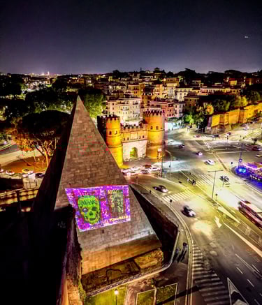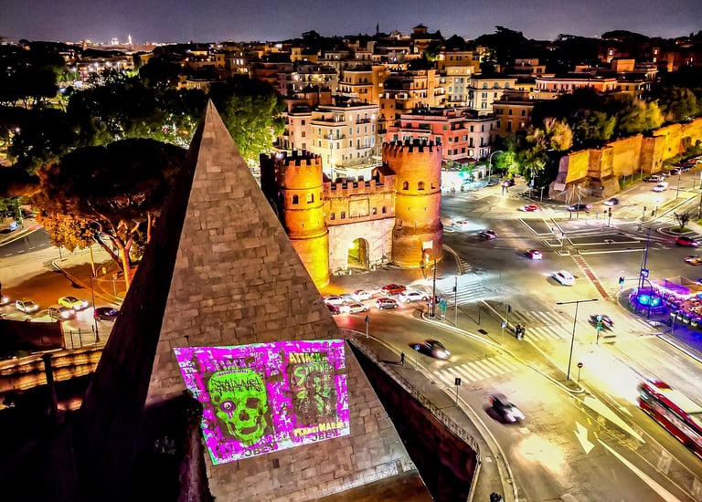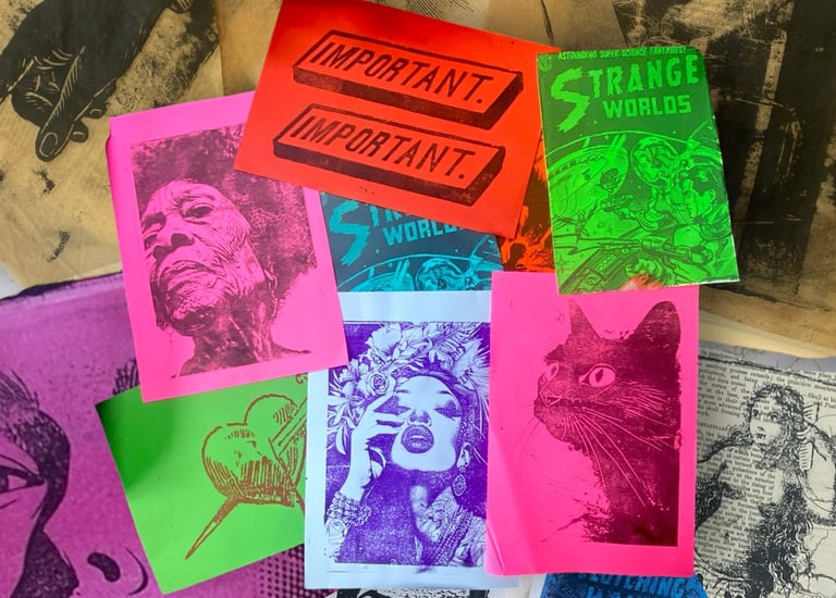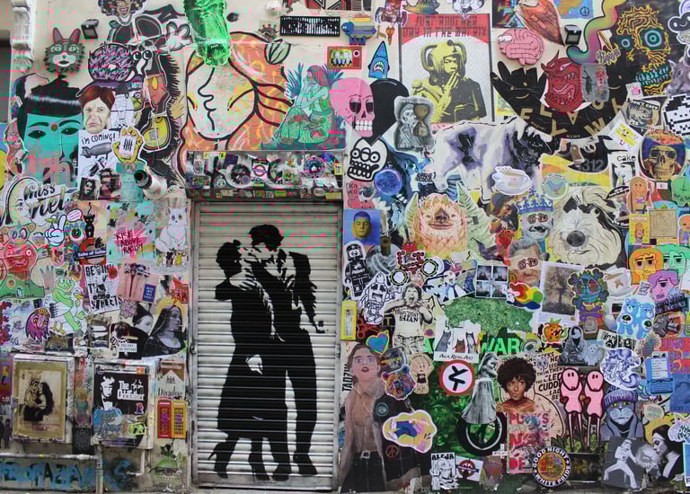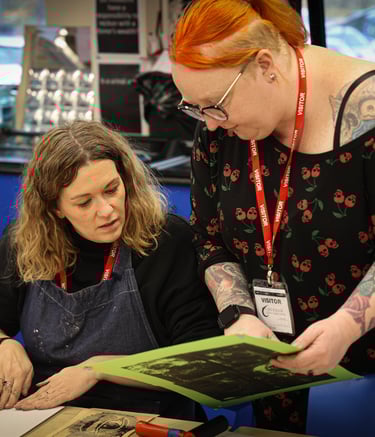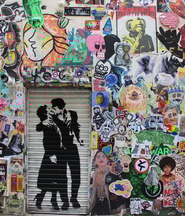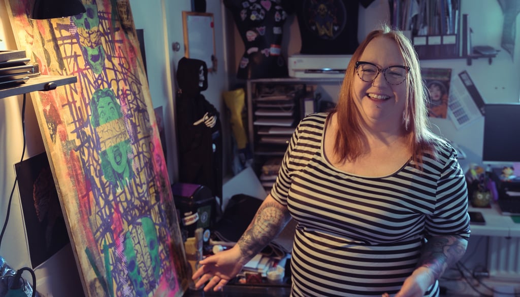 Her work sits at the crossroads of contemporary art, street art, and experimental printmaking, transforming dark humour into luminous visual storytelling.