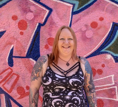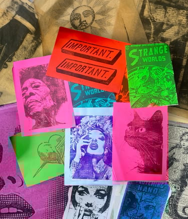 Sarah Calavera is a UK‑based graphic artist, printmaker, and creative explorer known for her bold fusion of gothic aesthetics, neon colour palettes, and retro pop culture influences.